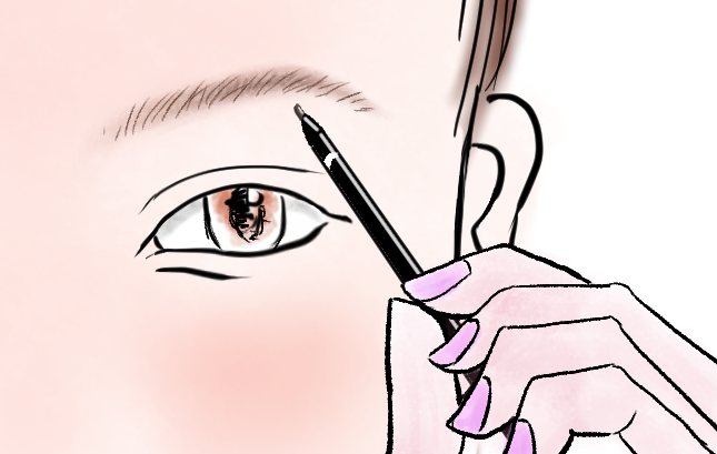先ほどのパウダーより少し濃い色味のペンシルで自眉が薄く見えるポイントを意識し