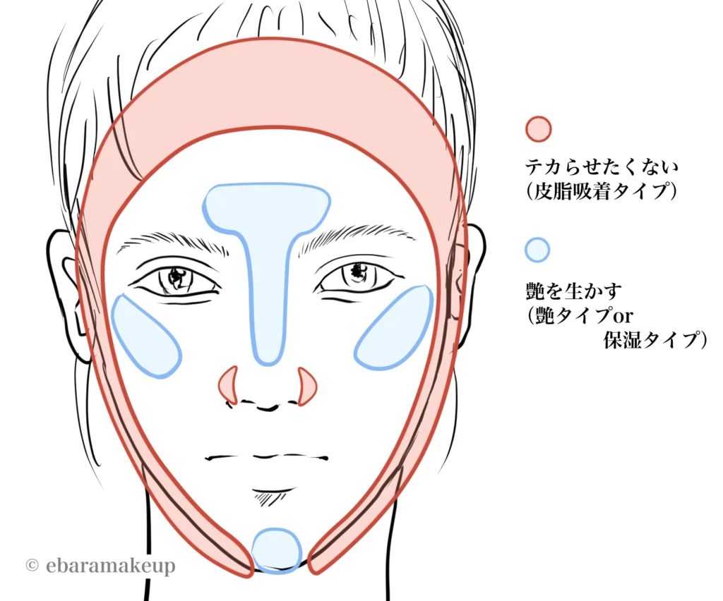 反対に、青い部分であるTゾーン・頬骨・顎には艶系のベースを使用、ほどよいテカリが艶やハイライトのように見え