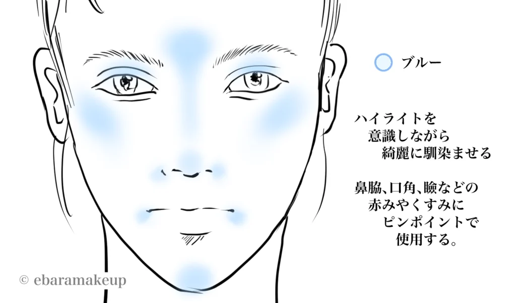 ブルーを全体に塗る場合は顔の中心から外に向けて薄く伸ばす様に塗って下さい。