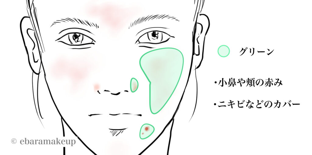 赤みと補色関係にあるグリーンを使うことで、ニキビ跡や小鼻まわり