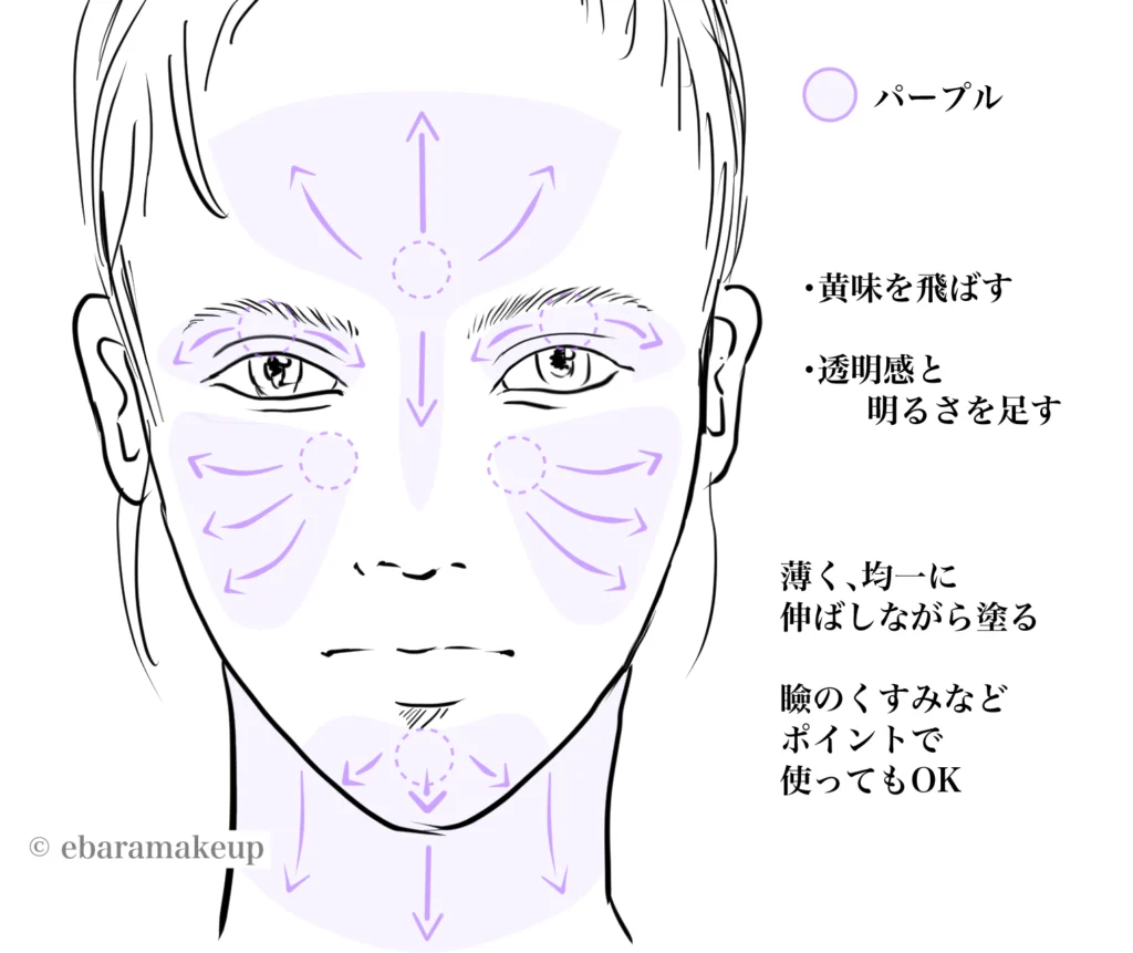 パープルの化粧下地は、黄ぐすみを飛ばし、肌に透明感と明るさを与えるためのカラーコントロール下地です。